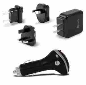Zestaw zawiera ładowarkę sieciową oraz samochodową, do której można podłączyć dowolne urządzenie z kablem USB. Ładowarka posiada wbudowany bezpiecznik chroniący instalację przed przepięciami.