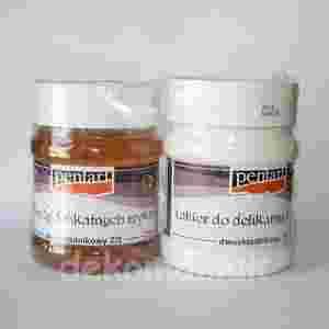 z porcelany lub glazurowanych. Na udekorowaną powierzchnię nakładamy pierwszą warstwę lakieru(1/2),po jej wyschnięciu drugą(2/2).którą dokładnie rozcieramy na powierzchni.Powstałe spękania można ciekłą patyną lub pastą postarzającą.