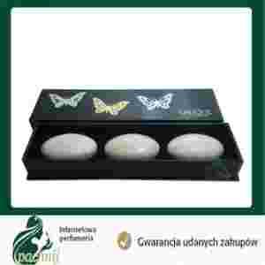Zestaw zawiera: Lalique Fleur de Cristal mydełko 25g, Lalique Encre Noir Pour Elle mydełko 25g, Lalique Amethyst mydełko 25g
