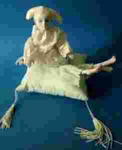 LALKA PORCELANOWA SIEDZĄCA NA PODUSZECZCE