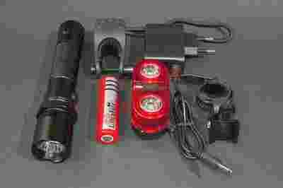 Latarka przednia wykonana jest ze stopu aluminium lotniczego, wszystkie gwinty zabezpieczone są gumowymi uszczelkami, jest odporna na zamoczenie. Ma 3 tryby pracy, ciągła 100%, ciągła 50% i strobo. Dodatkowo posiada gniazdko ładowania, dzięki czemu nie trzeba wyjmować akumulatora. Akumulator to UltraFire 3000mAh, na tylnej części latarka posiada kompas. Do zamocowania latarki na kierownicy jest gumowy uchwyt, odporny chyba na wszystko. Jest bardzo sztywny, więc nie ma obaw iż latarka mogłaby gdzieś wypaść.