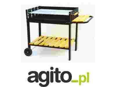 wykonanie z lakierowanej blachy stalowej; korpus urządzenia w kolorze czarnym, pokryty lakierem żaroodpornym; dzielone, chromowane ruszty grillowe; pobocznica z regulacją wysokości rusztu; wykonana z drewna półka boczna (x1) i półka dolna (x1); podstawa jezdna; powierzchnia grillowania 75 x 26 cm (x2) - odpowiedni dla około 14 osób