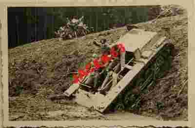 OPIS: Landwirtschaftliche Schlepper (LaS). Unikatowe zdjęcie pierwowzoru pierwszych niemieckich czołgów. Wobec ograniczeń traktatu wersalskiego, Niemcy znaleźli sposób przeciwstawienia się ograniczeniomprodukcji. Zanim pojawiły się Panzer 1 Ausf. A, wyprodukowali 15czołgowychkadłubówbeznadbudówki i uzbrojenia. Nazwali je traktorami rolniczymi.