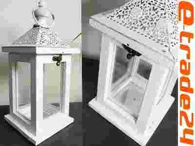 - Przedmiotem sprzedaży jest drewniano-szklany lampion z metalowymi zdobieniami.