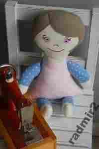 Laura to urocza lala - szatyneczka, gustuje w pastelach :-) Włoski ma polarowe, rączki i nóżki z fioletowej dzianiny w białe kropeczki, korpusik z różowej flanelki. Oczy, usta, nos namalowane ręcznie farbami do tkanin.