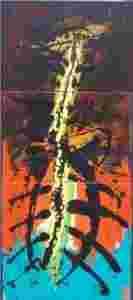 W tym przypadku trójkolorowy zestaw turkusu, pomarańczy i brązu przetykanego brudną czerwienią, jest tłem dla jasnożółtych smug i grubych czarnych linii, tworzących otoczkę dla żółtego tworu, którego zestawienie kolorystyczne i kształt układają się w obraz przypominający zdeformowaną żyrafę. Brutalne cięcie rozrywające pionowo obraz zdaje się być bramą do innego świata, do szerszego poznania.
