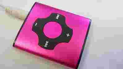 Ładny, zgrabny odtwarzacz mp3, różowy, metaliczny kolor.