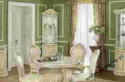 Piękna i luksusowa kolekcja mebli do salonu i jadalni. Meble włoskie, wyprodukowane z materiałów o wysokiej jakości i parametrach wg norm unijnych EN309. Korpusy i fronty pokryte okleiną imitującą korzeń wiązu w kolorze beżowym z perłową poświatą. Wykończenie na wysoki połysk. Wszystkie elementy kolekcji pokryte są czterokrotną warstwą lakieru poliestrowego. Lakiery poliestrowe, wielowarstwowe dają powłoki o wybitnej trwałości i dobrym, długo zachowanym połysku. Dlatego nasze meble pokryte lakierem poliestrowym na długo zachowują wygląd nowych, nienaruszonych "zębem czasu". Ponadto meble pokryte tym lakierem przepięknie błyszczą i rozświetlają wnętrze w którym się znajdują. Wprowadzają do salonu/jadalni klimat elegancji i luksusu. Linię i styl mebli podkreślają zaokrąglone drzwi z rzeźbionymi misternie szczegółami płaskorzeźby. Dodatkowym, bogatym elementem sa ręcznie wykonane, złote, owalne wkładki na drzwiach witryn i bufetów. W witrynach wbudowano punkty świetlne a szklane drzwi posiadaja dekoracyjne frezy. W wiszących uchwytach szafek zamontowano piękne kryształy. Meble Leonardo wykonane są z najwyższą starannością. Wszystkie elementy kolekcji, każdy detal charakteryzuje dbałość o szczegóły wykonania.