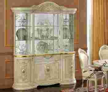 Piękna i luksusowa kolekcja mebli do salonu i jadalni. Meble włoskie, wyprodukowane z materiałów o wysokiej jakości i parametrach wg norm unijnych EN309. Korpusy i fronty pokryte okleiną imitującą korzeń wiązu w kolorze beżowym z perłową poświatą. Wykończenie na wysoki połysk. Wszystkie elementy kolekcji pokryte są czterokrotną warstwą lakieru poliestrowego. Lakiery poliestrowe, wielowarstwowe dają powłoki o wybitnej trwałości i dobrym, długo zachowanym połysku. Dlatego nasze meble pokryte lakierem poliestrowym na długo zachowują wygląd nowych, nienaruszonych "zębem czasu". Ponadto meble pokryte tym lakierem przepięknie błyszczą i rozświetlają wnętrze w którym się znajdują. Wprowadzają do salonu/jadalni klimat elegancji i luksusu. Linię i styl mebli podkreślają zaokrąglone drzwi z rzeźbionymi misternie szczegółami płaskorzeźby. Dodatkowym, bogatym elementem sa ręcznie wykonane, złote, owalne wkładki na drzwiach witryn i bufetów. W witrynach wbudowano punkty świetlne a szklane drzwi posiadaja dekoracyjne frezy. W wiszących uchwytach szafek zamontowano piękne kryształy. Meble Leonardo wykonane są z najwyższą starannością. Wszystkie elementy kolekcji, każdy detal charakteryzuje dbałość o szczegóły wykonania.