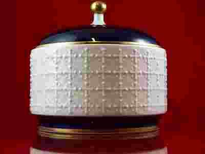 Wyrób z bardzo dobrej jakości porcelany w kolorze bieli.Stronę zewnętrzną zdobi wypukły,wyczuwalny wzór geometryczny,powierzchnia błyszcząca.Przykrywa i dolna partia pokryta została głębokim,prawdziwym kobaltem.Całość dopełniono elegancką sterczyną,która wraz z konturami podkreślona została złotem.