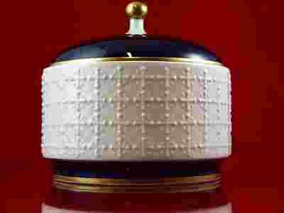 Wyrób z bardzo dobrej jakości porcelany w kolorze bieli.Stronę zewnętrzną zdobi wypukły,wyczuwalny wzór geometryczny,powierzchnia błyszcząca.Przykrywa i dolna partia pokryta została głębokim,prawdziwym kobaltem.Całość dopełniono elegancką sterczyną,która wraz z konturami podkreślona została złotem.