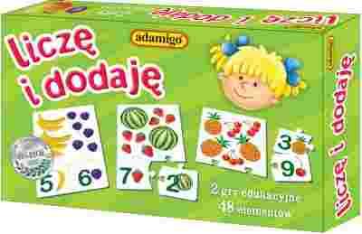 Układanka „Liczę i dodaję” składa się z 48 puzzli, z których można ułożyć 16 kompletów. Na każdy z nich składa się duży puzzel z obrazkiem dwóch rodzajów owoców oraz dwa mniejsze z cyframi i owocami, które odpowiadają liczbie owoców z dużego puzzla. W środku pudełka znajduje się instrukcja z opisem dwóch gier