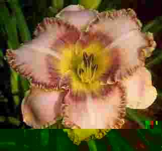Cielisty róż z bordowym pierścieniem i bordowym obrzeżem, dodatkowo mocna żółta koronka, duży kwiat, cudny. Jedna z ciekawszych odmian
