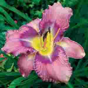 Piękna wielobarwna odmiana liliowca z bogatą koronką, z dużą lila - niebieską plamą, bordowo obrzeżoną i złotym środkiem, kwiaty bardzo duże
