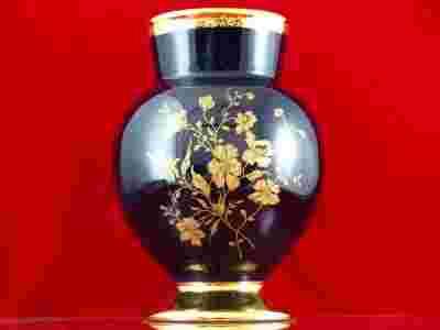 Wyrób ze szlachetnej,grubościennej porcelany o malowniczym fasonie.Całość zalano głębokim,kobaltowym szkliwem o powierzchni błyszczącej.W centralnym miejscu obiektu wkomponowano kwiatową dekoracją z przewagą satynowego złota.Wylew i podstawę zalano błyszczącym złotem co nadało niezwykłej elegancji.