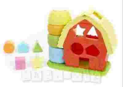 Otwory w budynku stodoły mają kształt gwiazdki, trójkąta, koła, pięciokąta oraz kwadratu, do których maluch dopasowuje kolorowe klocki z motywami domowych zwierzątek.