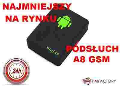 A8 to moduł podsłuchowy działający w technologii GSM, dzięki czemu umożliwia prowadzenie podsłuchu z dowolnego miejsca. Wystarczy zadzwonić na numer karty SIM zainstalowanej w urządzeniu, aby uzyskać automatyczne połączenie i możliwość monitorowania dźwięków w otoczeniu podsłuchu. Zastosowano dwa czułe mikrofony wychwytujące dźwięki rozmowy w odległości do 5-6m od urządzenia, umożliwiając skuteczne podsłuchiwanie w średniej wielkości pomieszczeniach. Użycie dwóch mikrofonów polepsza słyszalność dźwięku. Dzięki takiemu rozwiązaniu i niewielkim wymiarom z powodzeniem może być zastosowany do monitorowania posesji, biura czy samochodu.