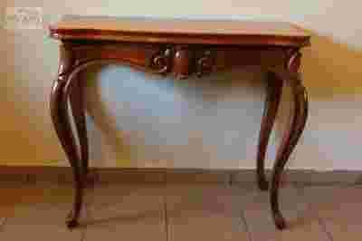 Piękny, ludwikowski stolik typu karciak pochodzący z połowy XIX w. Wykonany w Europie Zachodniej. Konstrukcja mebla i blat wykonany z litego dębu. Listwa pod blatem o nieregularnym kształcie, zdobiona na froncie gustowną snycerką. Nogi wysuwają się kryjąc miejsce na karty. Stolik przeznaczony do różnego typu gier - stąd jego nazwa. Może służyć również jako konsolka przyścienna i rozkładany stolik okazjonalny.