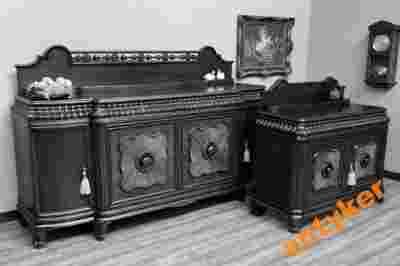Meble wykonane z początku ubiegłego stulecia z dębu częściowo fornirowane dębem, utrzymane w miłym i przyjemnym odcieniu ciemnego brązu.