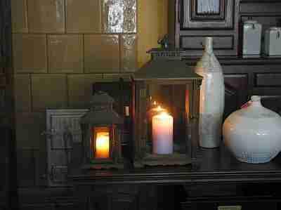 Bardzo efektowną częścią lampionu jest piękna, metalowa kopuła z ładnymi wytłaczanymi wzorami oraz podtrzymujące ją rzeźbione kolumny. Lampion posiada otwierane drzwiczki i uchwyt umożliwiający jego przenoszenie lub zawieszenie.