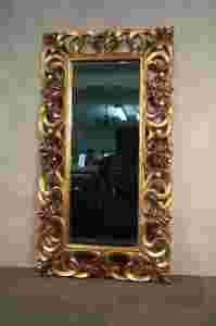 Zapraszamy do licytacji uroczego, bardzo efektownego lustra, które będzie prawdziwą ozdobą luksusowego wnętrza. Rama wykonana jest z żywicy, pokryta płatkami szlagmetalu i zabezpieczona lakierem. Jest w kolorze złotym, miejscami patynowana.