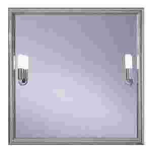 Lustro w ramie aluminiowej w kolorze chromu podświetlone dwoma kinkietami o nowoczesnej formie.