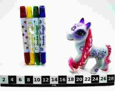 W zestawie znajdują się: - kucyk - 4 nietoksyczne, w pełni bezpieczne flamastry Flamastry posiadają dwie końcówki. Pierwsza to pisak, druga to pieczątka. Flamastry można ze sobą łączyć, aby uzyskać nowe kolory (na opakowaniu pokazane są kombinacje jakie można stworzyć). Zabawka dla dzieci powyżej 3 roku. Zabawka jest zupełnie nowa i zapakowana w oryginalne opakowanie.