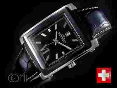 Piękny męski zegarek w formie klasycznego prostokąta. Koperta stalowa skręcana, ramka nad szybką to czarna stal (IP BLACK) błyszcząca, fazowane boki w lekkim macie. Pozostała część koperty stalowa polerowana. Cyferblat zegarka jest koloru ciemnogranatowego z tłoczonym wzorem składającym się z małych logo marki, opisany indeksem- na godzinie "12" umieszczony został datownik.