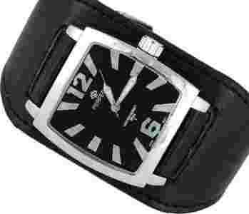 Wytrzymały czarny pasek. Koperta koloru srebrnego, tarcza czarna. Oznaczenia godzin i wskazówki srebrne.