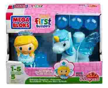 Zestaw klocków Mega Bloks Mała księżniczka i jej jednorożec. Księżniczki wraz ze swoimi przyjaciółmi – jednorożcami, podróżują po całym swoim królestwie, by poznawać innych ludzików. Zestaw zawiera figurkę księżniczki, jednorożca oraz brokatowe klocki, łącznie 5 elementów. Księżniczka ma ozdobną tiarę, która wysuwa się, gdy usiądzie na swoim koniku lub na klocku. Jednorożec ma natomiast zdejmowane skrzydełka. Klocki idealne dla maluszków już od 1 roku życia. Ich duży kształt, idealnie dopasowany jest do małych rączek dziecka.