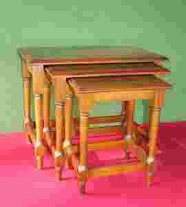 Na tej aukcji proponujemy Państwu stylowy komplet trzech niewielkich stoliczków śniadaniowych, kawowych, pod telefon, etc. Stoliki wykonane niezwykle starannie i solidnie z twardego szlachetnego drewna (dąb lub buk) w kolorze ciepłego brązu. Stoliki można wsunąć jeden pod drugi jak szuflady czyli nie zajmują zbyt dużo miejsca. Mebelki interesujące, ładne i niezwykle praktyczne. Komplet nie jest nowy i nosi normalne ślady używania ale z pewnością będzie doskonałą ozdobą gustownego wnętrza;zarówno w starym stylu jak i nowoczesnego.