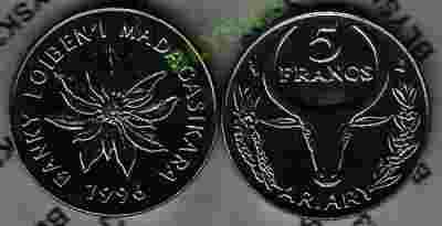 MADAGASKAR /KM-21/ 5 FRANCS 1996 r.Kwiat-Rogacz