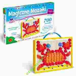 "Magiczne mozaiki" to kreatywna zabawka edukacyjna dla dzieci, młodzieży i dorosłych. Do waszej dyspozycji oddana zostaje plansza z mnóstwem otworów, w których należy umieścić różnej wielkości kolorowe elementy, by stworzyć rozmaite wzory i obrazy. W każdym pudełku znajduje się album z ponad 100 przykładowymi wzorami. Wielkość planszy (sita): 196x143 mm