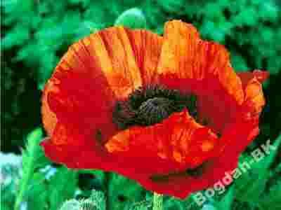 Dziko rośnie na Kaukazie i w Iranie. Rośliny osiągają wysokość nawet 1m i całe pokryte są szczeciniastymi włoskami. Liście pierzastosieczne mają barwę jasnozieloną, a duże kwiaty osadzone pojedynczo na pędach są intensywnie czerwone z czarną plamą u nasady płatków. Odmiany mogą mieć kwiaty czerwone w różnych odcieniach, różowe, białe, a także dwubarwne. Kwitnienie przypada w maju i czerwcu.