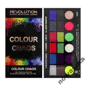 Makeup Revolution Colour Chaos to paleta cieni do powiek, składająca się z 12 błyszczących i 6 matowych cieni, zamkniętych w pudełku z lusterkiem i dwustronnym aplikatorem.