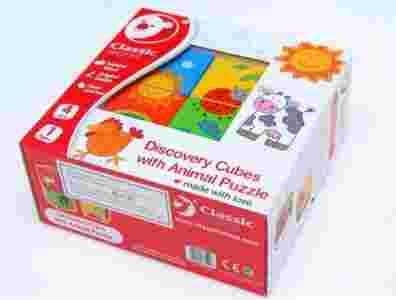 4 kolorowe klocki - każdy w innym kolorze - tworzą 4 różne obrazki. Znajdźcie pasujące części, a Waszym oczom ukaże się krówka, słoneczko, kurka lub biedronka.