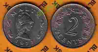 MALTA /KM-9/ 2 CENTS 1977 r.Rybki