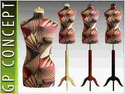 Tors osadzony jest na eleganckim drewnianym stojaku z chromowaną rurą,  na której można  regulować  wysokość manekina pokrętłem.
