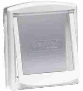 Oprawa przejścia wykonana jest z białego tworzywa sztucznego, odpornego na opady atmosferyczne. W komplecie znajdują się dwie oprawy - zewnętrzna oraz wewnętrzna. Dzięki temu unikniemy otworu o ostrych krawędziach na wewnętrznej stronie drzwi frontowych. Drzwiczki wyposażone zostały również w klapkę blokującą, która zapobiega ich otwarciu z obu stron, dodatkowo uszczelniając i wyciszając drzwi.