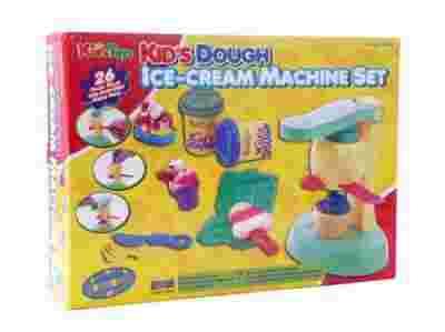 Zestaw zawiera maszynkę do robienia lodów, 4 tuby z ciastoliną, wyciskarkę z wymiennymi wkładami, pucharek na lody, akcesoria kuchenne.