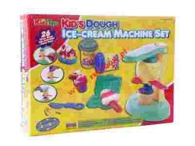 Zestaw zawiera maszynkę do robienia lodów, 4 tuby z ciastoliną, wyciskarkę z wymiennymi wkładami, pucharek na lody, akcesoria kuchenne.