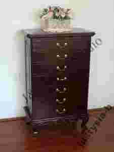 Przedmiotem aukcji jest elegancka komoda z 7 szufladami, wykonana w całości z litego drzewa mahoniowego w kolorze ciemnobrązowym (ciemny kasztan delikatnie przechodzący w mahoń). Komoda jest ciężka i stabilna. Jest bardzo solidnie i precyzyjnie wykonana. Główny jej atut to piękne, ręcznie wykonane zdobienia. Mosiężne uchwyty. Komoda jest nowa.
