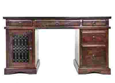 Mebel wykonany z wysokiej jakości litego drewna, w kolorze ciemnobrązowym (palisandru indyjskiego). Wyposażony w pięć szuflad z metalowymi uchwytami oraz szafkę zamykaną drzwiczkami z metalowymi zdobieniami.