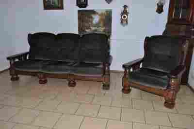 MASYWNY WELUROWY DĘBOWY KOMPLET SOFA I FOTEL 3 + 1