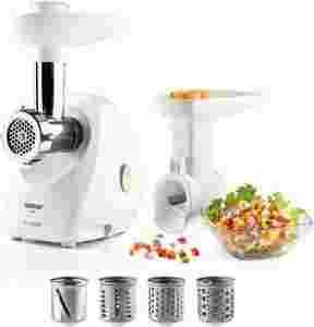Maszynka wyposażona jest również nasadkę masarską, w szatkownicę z zestawem 4 bębnów tnących (bęben do cięcia na plastry, bęben do przecierania, bęben do tarcia (wiórki) i bęben do tarcia) - dzięki tej przystawce szybko przygotujesz zdrowe sałatki warzywne oraz w krajarkę do krojenia w kostkę.