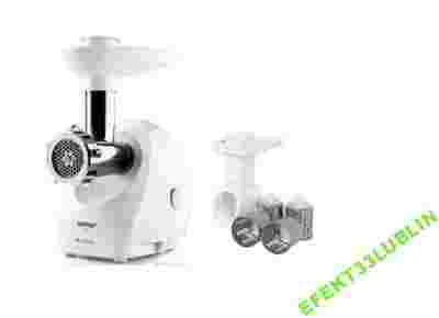 Niezawodna i wydajne maszynka do mielenia. Silnik maszynki osiąga moc aż 1500 W (peak power), dzięki czemu maszynka pracuje bardzo wydajnie - w minutę zmieli aż 2,3 kg/min. Maszynka wyposażona jest w trzy sitka o trzech średnicach otworów dopasowanych do różnych produktów - największe 8 mm do mięs, średnie - 4 mm, np. do serów i warzyw, najmniejsze 2,7 mm, np. do maku. Urządzenie posiada zabezpieczenie przed zniszczeniem silnika - sprzęgło oraz nożyk dwustronny, zapewniają dłuższą żywotność. Maszynka wyposażona jest również w szatkownicę - dzięki tej przystawce szybko przygotujesz zdrowe sałatki warzywne.
