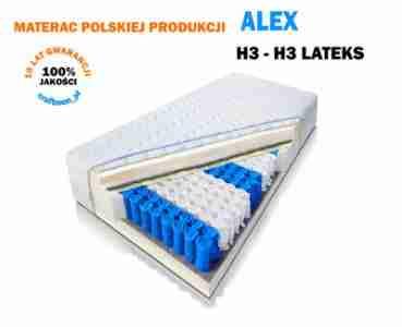 Materac Alex zbudowany jest z wysokiej jakości komponentów. Środkiem materaca są sprężyny kieszeniowe 9 stref obłożone od góry i od dołu pianką wysoko elastyczną. Góra materaca zaliczana do kategorii twardej H3 wyposażona jest dodatkowo w piankę lateksową umieszczoną na wierzchu. Dolna strona materaca zaliczana jest do kategorii H3 średnio twardej.
