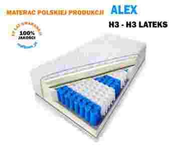 Materac Alex zbudowany jest z wysokiej jakości komponentów.  Środkiem materaca są sprężyny kieszeniowe 9 stref obłożone od góry i od dołu pianką wysoko elastyczną. Góra materaca zaliczana do kategorii  twardej H3 wyposażona jest dodatkowo w piankę lateksową umieszczoną na wierzchu. Dolna strona materaca zaliczana jest do kategorii H3 średnio twardej.