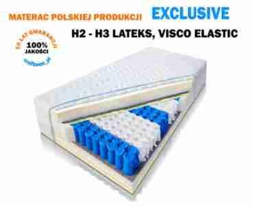 Materac Exclusive zbudowany jest z wysokiej jakości komponentów.  Środkiem materaca są sprężyny kieszeniowe 9 stref obłożone od góry i od dołu pianką wysoko elastyczną. Góra materaca zaliczana do kategorii średnio twardej H2 wyposażona jest dodatkowo w podwójną piankę lateksową umieszczoną na wierzchu. Dolna strona materaca zaliczana do kategorii H3 średnio twardej, wyposażona jest dodatkowo w piankę termo elastyczną Visco Elastic (memory).