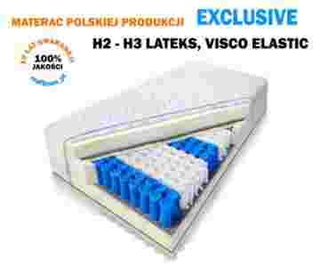 Materac Exclusive zbudowany jest z wysokiej jakości komponentów.  Środkiem materaca są sprężyny kieszeniowe 9 stref obłożone od góry i od dołu pianką wysoko elastyczną. Góra materaca zaliczana do kategorii średnio twardej H2 wyposażona jest dodatkowo w podwójną piankę lateksową umieszczoną na wierzchu. Dolna strona materaca zaliczana do kategorii H3 średnio twardej, wyposażona jest dodatkowo w piankę termo elastyczną Visco Elastic (memory).